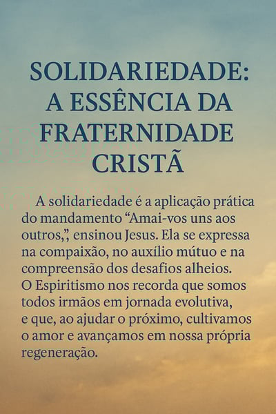 A solidariedade é um elo sagrado que aproxima corações, impulsiona a regeneração da humanidade e prepara a Terra para um futuro de paz. Inspirados pelos ensinamentos dos Espíritos, sejamos sementes de amor e fraternidade onde estivermos, conscientes de que cada gesto solidário é um passo em direção à nossa própria iluminação.